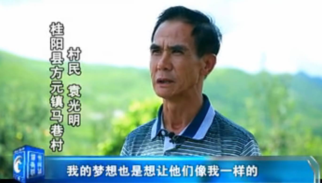 袁光明說:我的夢想也是想讓他們像我一樣的,我們南方山多,那個(gè)荒山野嶺很多,就是發(fā)展起來,就是第一個(gè)綠化了祖國,第二凈化了空氣,第三提高了人民的生活,達(dá)到了共同富裕。